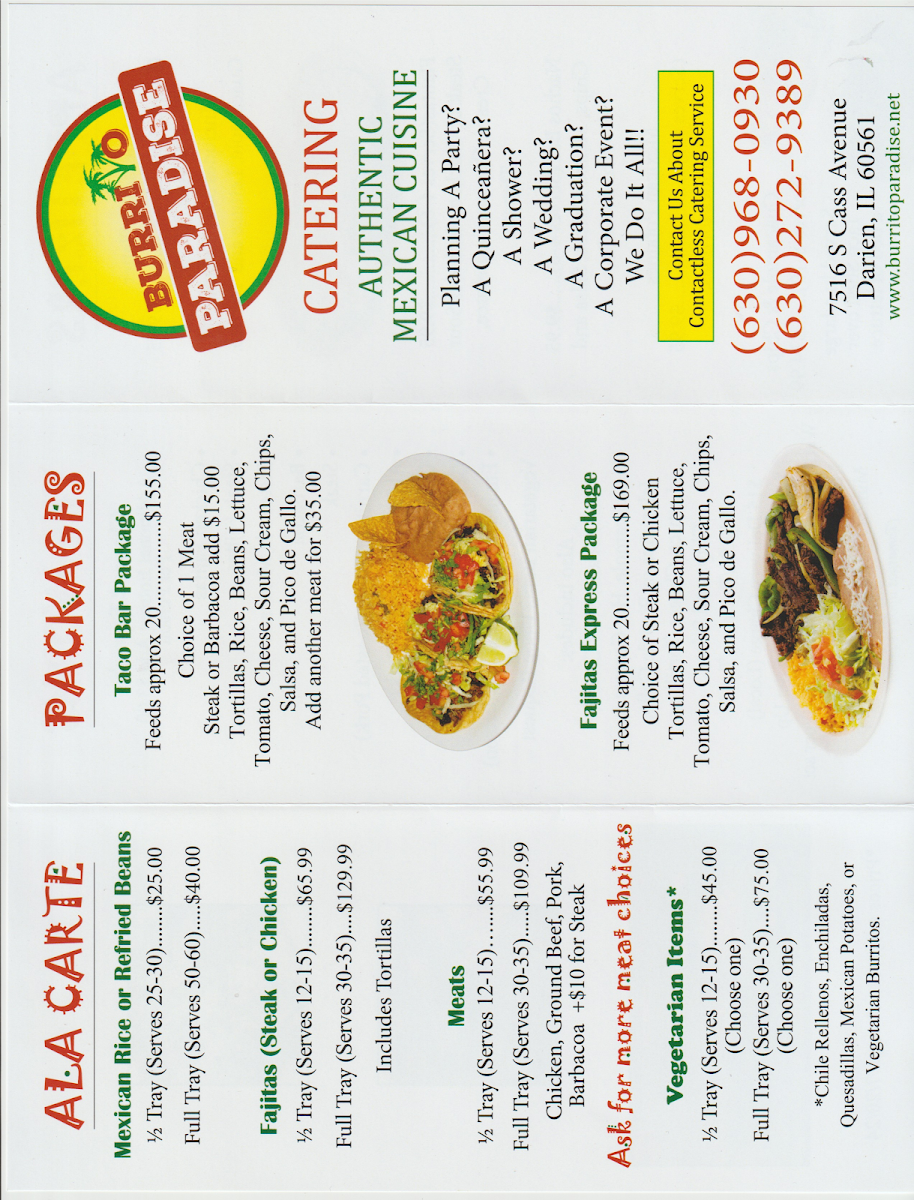 Burrito Paradise, located at 7516 S Cass Ave Unit 33, Darien, IL, offers a diverse and flavorful menu that caters to a variety of tastes and preferences. Their Burritos are a standout, with options like the Two Meat Burrito and Two Meat Burrito Bowl, perfect for those who crave a hearty meal. If you're in the mood for something crispy, try the Chimichanga or Chimichanga Burrito Bowl, both offering a delightful crunch. For a lighter option, the Veggie Burrito Bowl is a great choice for vegetarians.