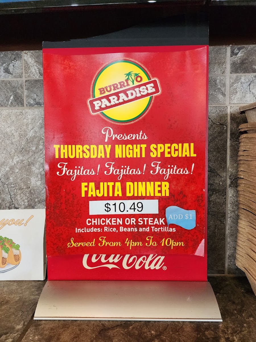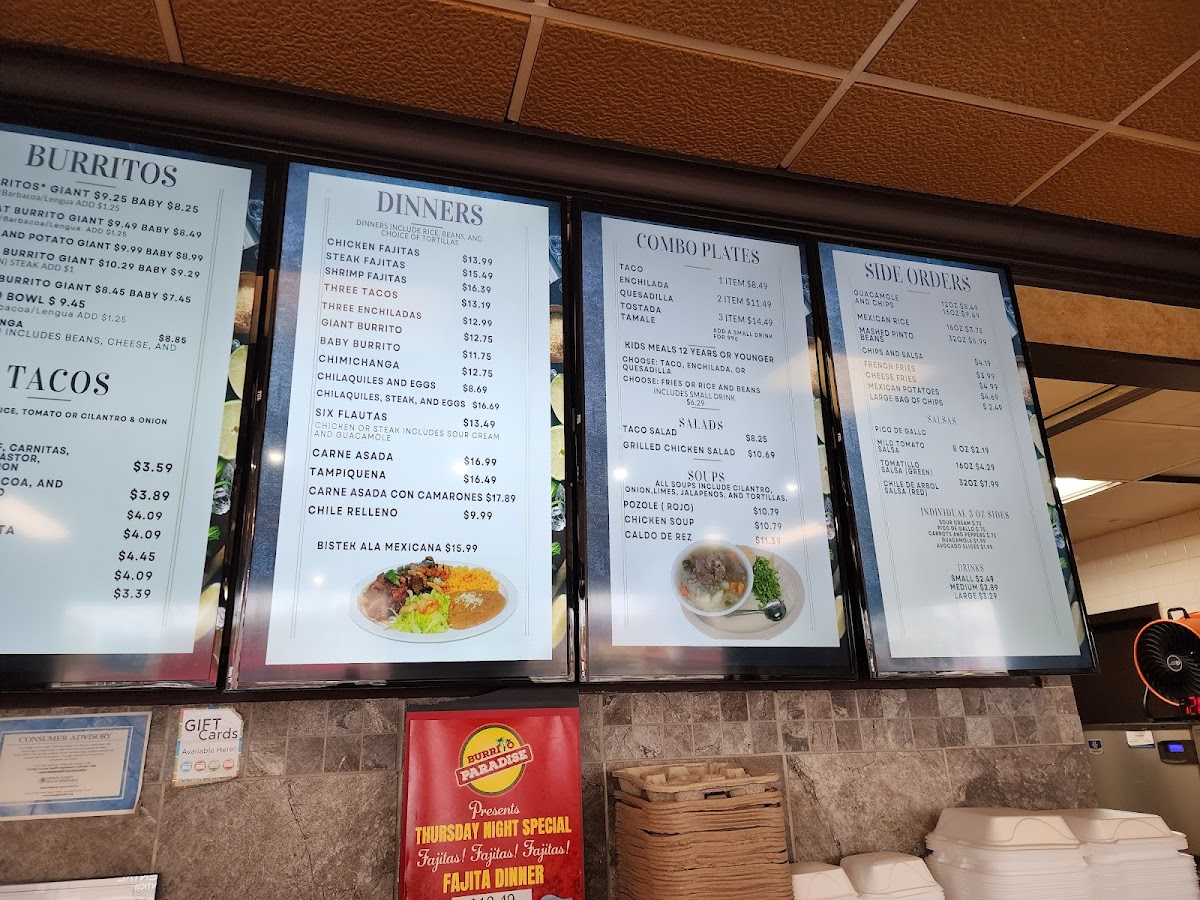 Tacos are a favorite at Burrito Paradise, with varieties such as the classic Taco, Shrimp Taco, and the flavorful Fajita Taco. For a more substantial meal, the Dinners section has satisfying options like the Chimichanga Dinner, Enchilada Dinner, and Tampiquena Dinner, among others. These dishes provide a perfect balance of traditional flavors and hearty portions.