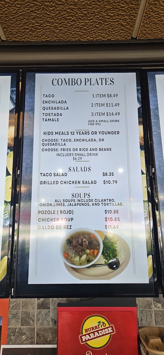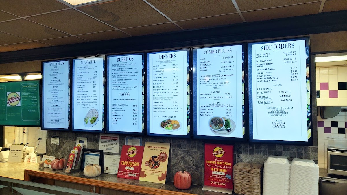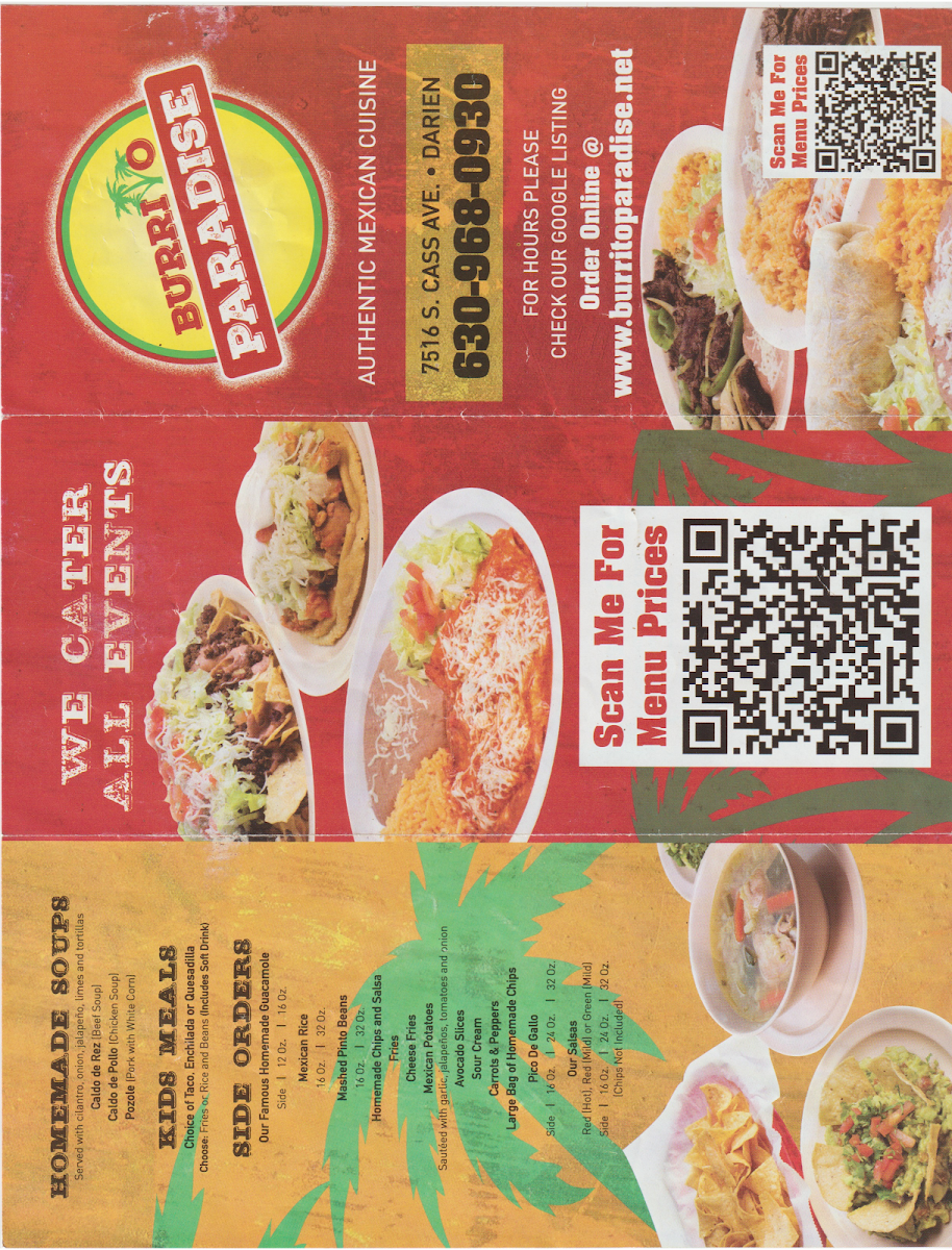 Overall, Burrito Paradise offers a wide-ranging menu that ensures there's something for everyone, whether you're looking for a light snack, a hearty dinner, or a sweet treat to round off your meal.