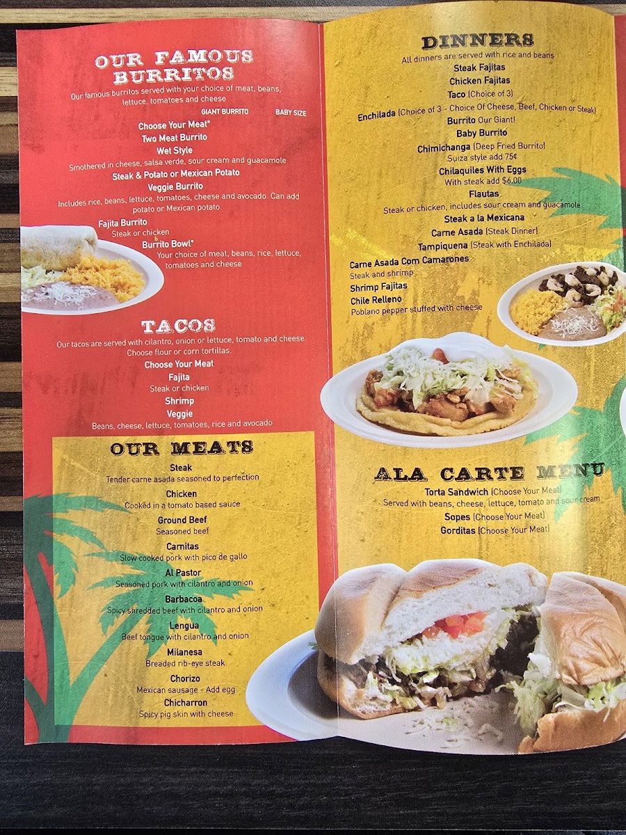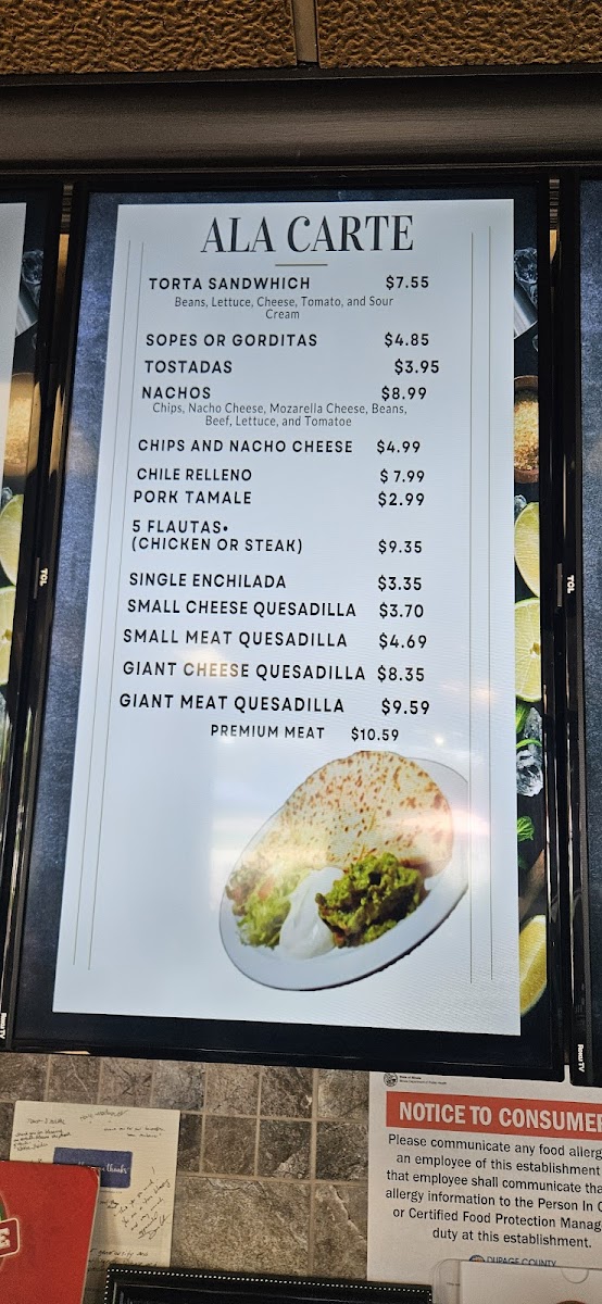 If you're in the mood for something sweet, the Churro is a must-try dessert, offering a delicious end to your meal. For those who prefer items a la carte, there are plenty of savory choices, including the Giant Meat Quesadilla, Torta, and a Single Enchilada, all perfect for a quick, satisfying snack.